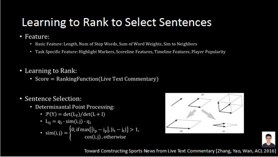 一是有关于比赛的实时比分的数据。第二,关于图片,我们通过计算机视觉分析图片内容,将它和文字结合。第三方面是知识库的建立,像比赛球队的历史,球员信息。第四,是网上有一些直播文字抓取过来的信息,我通过机器学习技术去挑选最重要的内容,融合进文章中。网上的直播文字信息其实非常复杂,有不重要的信息,甚至会夹杂网友的评论。我们在生成新闻的时候希望把比赛最重要的环节,像进球、判罚等等给找出来。