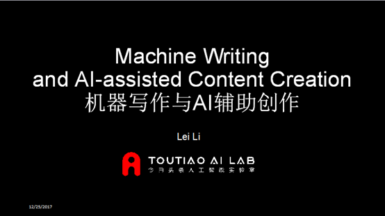 今日头条人工智能实验室技术总监李磊作为获奖团队代表在大会现场做了题为“机器写作与AI辅助创作”的报告。报告全文如下:
