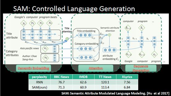 这是通过一个SAM模型,叫做Controlled Language Generation。这个模型有三方面,第一方面,是通过对标题建模,对语意属性建模,把所有这些都变成语义的向量,对标题建模用了SAM。第二方面,这些语义信息重要程度不同,我们通过一个机制区分这里面哪个语义标签是重要的。最后是生成,生成我们通过循环神经网。但在这个循环神经网里面,我们加入了前两步学到的语义信息去控制风格。这个方法我们在数量级上做测试发现越小越好,优于传统方法。如果大家可以感兴趣可以看这篇文章。