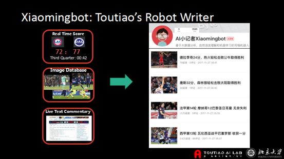 我们从去年6月开始做了一个机器人Xiaomingbot。一开始是做奥运会的赛事文章撰写。它包涵三方面的输入——实时比分,实时图片数据,以及热门比赛的文字直播。我们的机器人将这三方面融合起来,最后生成对应的文章。