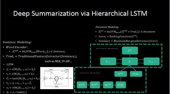 人工这部分工作我们通过层次化的LSTM模型对文章做建模。第一个维度是句子层面,通过循环神经网络对句子建模,学句子里面的语义信息,并且结合传统的模本特征,把它组合其他,最后组合成一个向量,用它来代表每一个句子。每天有很多句子,把这些代表句子含义的向量连起来,就变成一个向量的串。