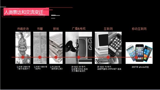信息被认为是人类的重大需求。在过去3000年,每一次技术的发展都为信息的交流以及人类表达和交互的方式带来了巨大变化,并促进了交流的效率和质量。最早没有科技的情况下,大家只能通过口口相传获得信息,所以传播范围很有限;后来印刷术的出现,让文字可以用纸张来承载保存并且广泛传播;再到上个世纪电子、通讯、无线电、网络的出现,让全世界各个角落的人都可以很方便接收到最新的信息。