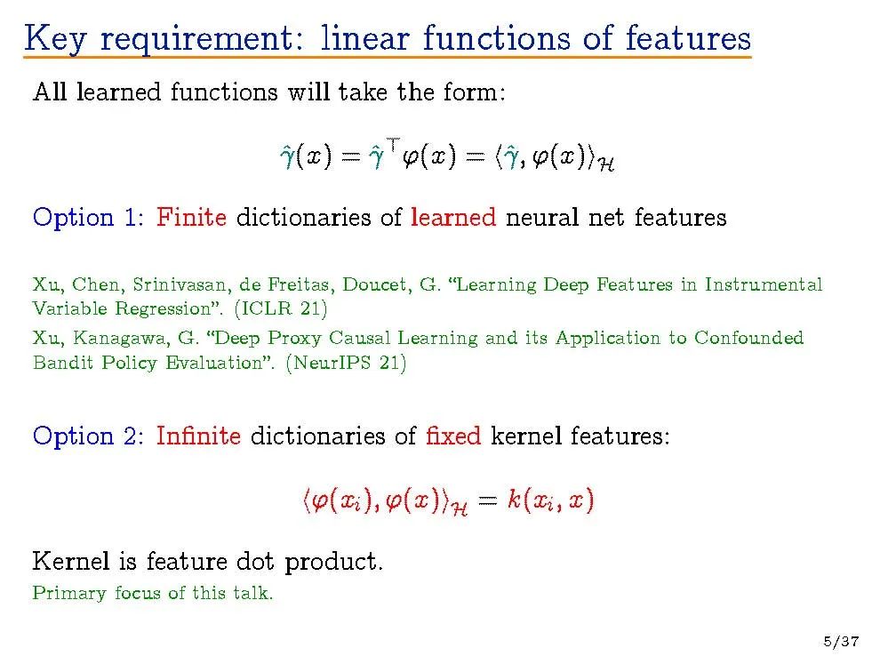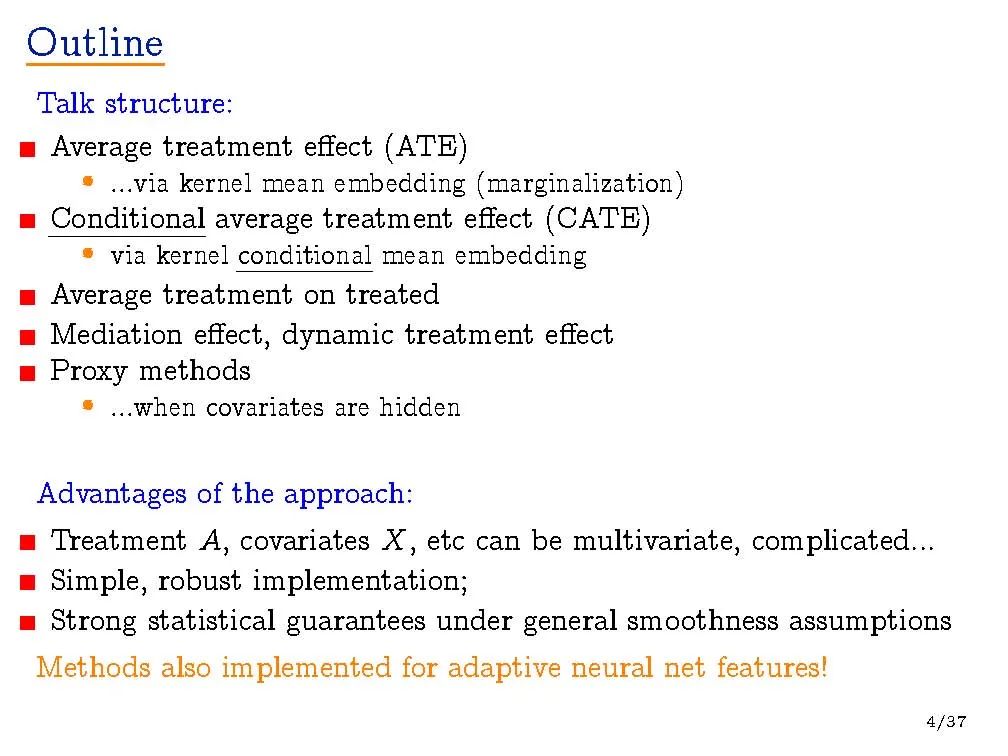 一个基本的因果建模任务是在观察到的协变量X存在的情况下,预测干预(或治疗)D= D对结果Y的影响。我们可以通过边缘化条件平均值E(Y|X,D)除以P(X)的估计得到平均治疗效果(ATE:干预D的预期结果)。更复杂的因果关系问题需要更细致的处理。例如,被治疗者的平均治疗(ATT)处理的是一个反事实:对接受d治疗的亚群体进行d'治疗的结果是什么?在这种情况下,我们必须在条件分布P(X\d)上边缘化\gamma,这对连续多变量d来说是一个挑战。许多附加的因果问题要求我们在条件分布上边缘化,包括条件ATE、中介分析、动态治疗效果,以及使用代理变量对未观察到的混杂因素进行校正。我们在非参数设置中使用核方法来解决这些问题,核方法可以应用于非常一般的处理D和协变量X(连续多元,字符串,组,…)我们通过核脊回归学习\gamma,并使用核条件均值嵌入对条件分布进行边缘化,这可以被认为是两阶段最小二乘的推广。我们在一般平滑假设下提供了强大的统计保证,并提供了直接而稳健的实现(几行代码)。