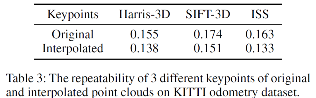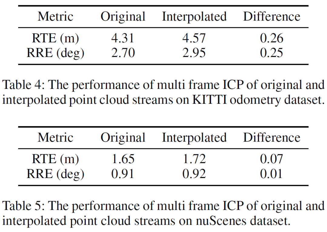 此外,为了进一步验证生成点云的质量,我们还在两个应用上面来比较插帧点云和真实点云的性能,分别是Keypoint detection(关键点检测)和Multi-frame ICP(多帧ICP算法)。下面点表格展示了实际算法应用的结果,可以看到使用插帧的点云与真实的点云的结果很接近,这从侧面反映了插帧所获得的点云的质量和相似度。