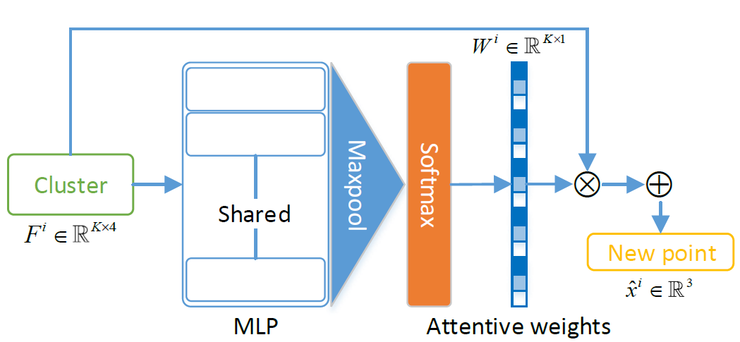 我们首先将这个特征图送入到一个Shared-MLP中来提取高维的特征,然后用一个max-pool以及Softmax函数来得到注意力权重,这个注意力权重是对于一个聚类中的每一个近邻点定义的,即每个点都会对应一个权重,理论上这个注意力机制可以给更符合最后的中间帧点云中的点更高的权重,而其他不重要的点的权重则更低,我们利用注意力权重对这K个近邻点进行加权求和以得到最后的生成的点云中的点。