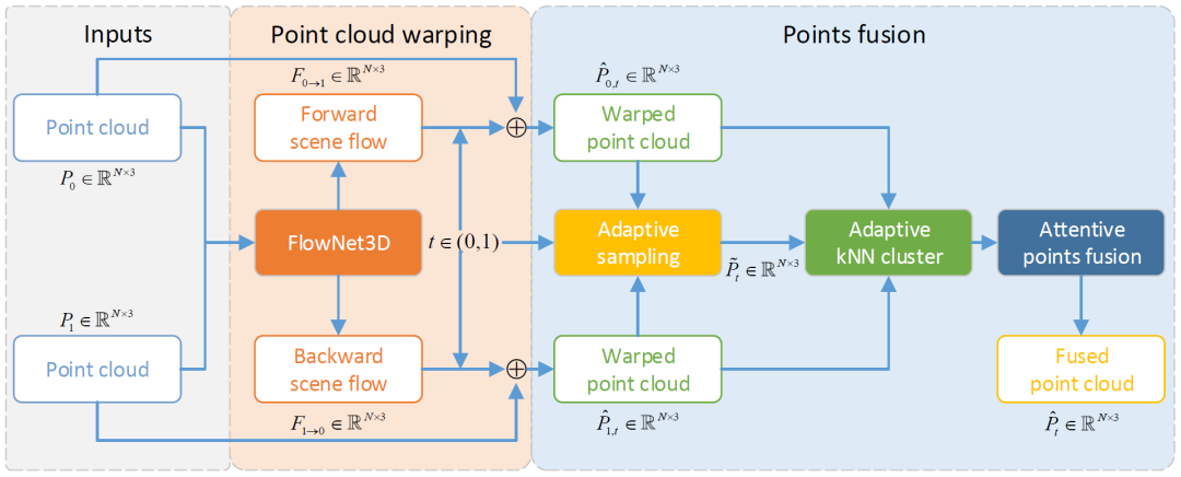 网络的主体部分主要由两个部分组成,分别是Point cloud warping (点云变换)和Points fusion (点融合)。其输入为两帧连续的点云以及给定一个位于(0,1)之间的时间点,输出则为网络所预测的在给定时间点的中间帧点云。网络的总体实现受到了视频插帧算法的很大的启发,并依据点云的特征来设计具体的网络结构。