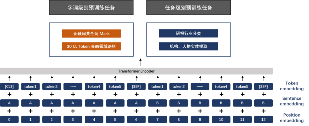 为了让模型更好地学习到语义层的金融领域知识,更全面地学习到金融领域词句的特征分布,我们同时引入了两类有监督学习任务,分别是研报行业分类和财经新闻的金融实体识别任务,具体如下: