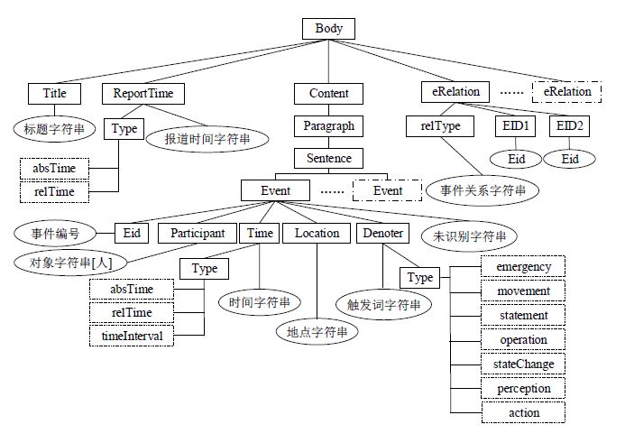 CEC 采用了 XML 语言作为标注格式,其中包含了六个最重要的数据结构(标记):Event、Denoter、Time、Location、Participant 和 Object。Event用于描述事件;Denoter、Time、Location、Participant 和 Object 用于描述事件的指示词和要素。此外,我们还为每一个标记定义了与之相关的属性。与 ACE 和 TimeBank 语料库相比,CEC 语料库的规模虽然偏小,但是对事件和事件要素的标注却最为全面。
