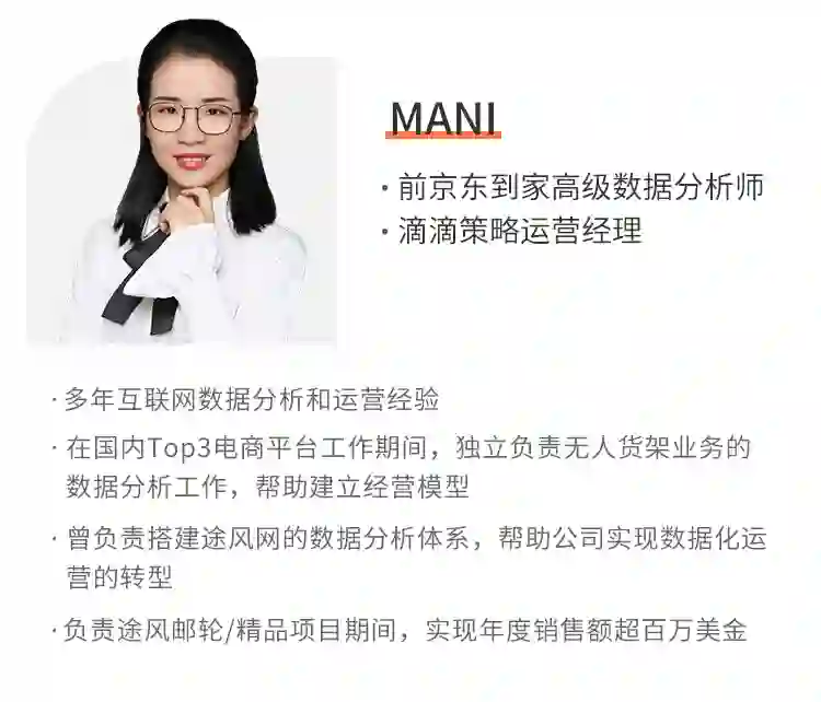 课程由前京东到家数据分析师、滴滴策略运营经理@Mani老师全程授课/辅导/陪练: