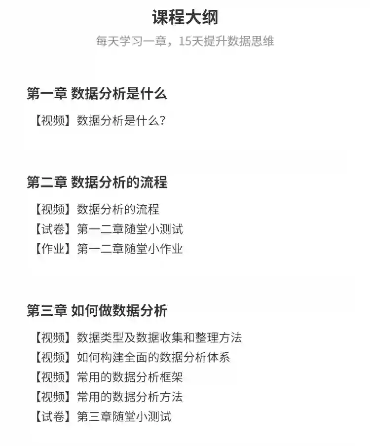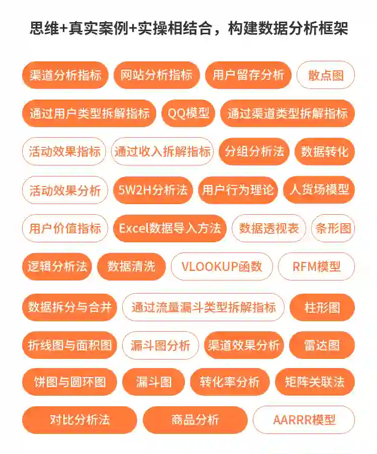 课程内容涵盖AARRR、RFM模型、QQ模型、用户行为理论、人货场模型等常用的数据分析框架以及常用的数据分析法。让你在15天时间充分涉猎足够广的知识与方法。