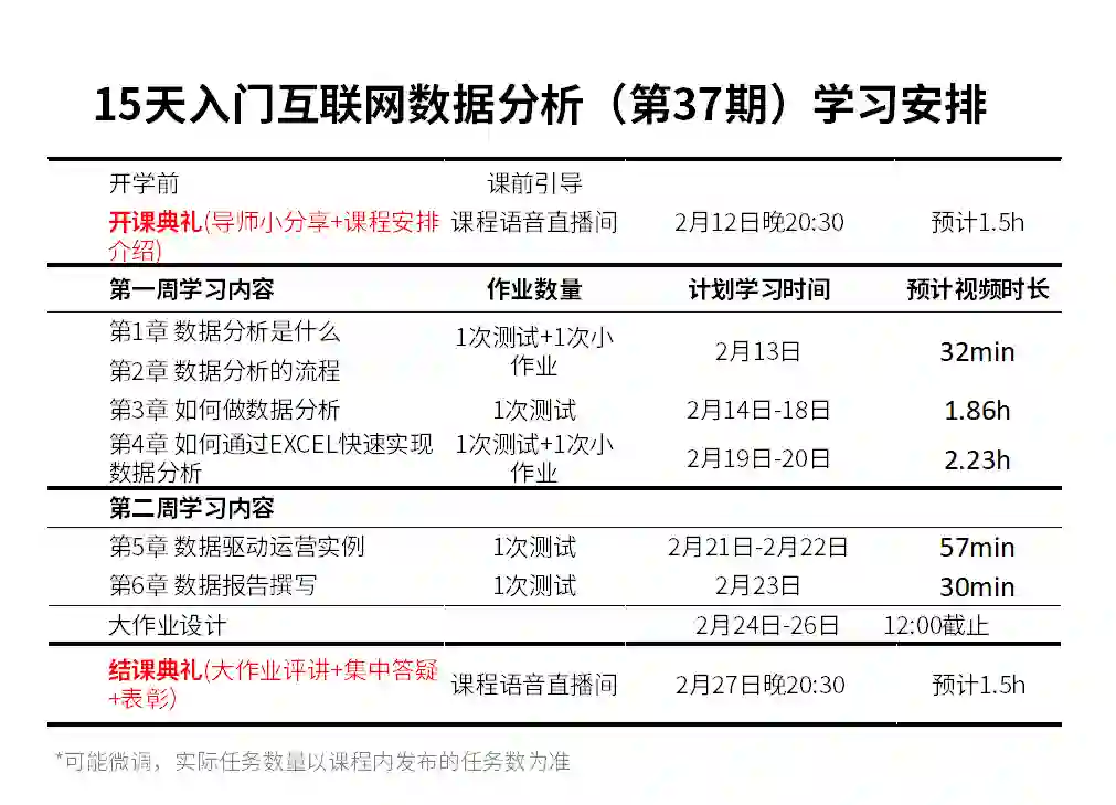 完整的课程学习由视频学习+章节小作业/测试+大作业+提问/答疑组成学习安排可以参考下方课程表:
