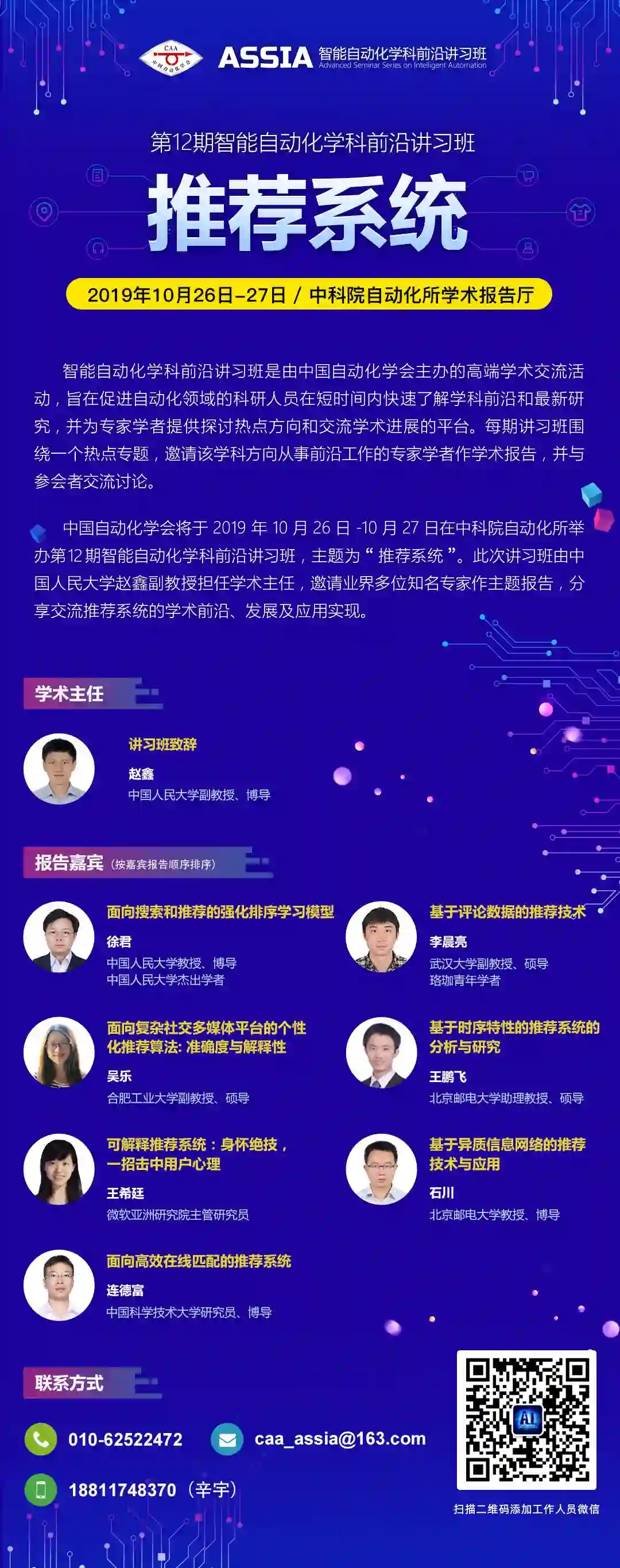 【导读】中国自动化学会将于2019年10月26日-10月27日在中国科学院自动化研究所举办第12期智能自动化学科前沿讲习班,主题为“推荐系统”。此次讲习班由中国人民大学赵鑫副教授担任学术主任,邀请业界多位知名专家作主题报告,分享交流推荐系统的学术前沿、发展及应用实现。