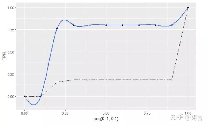 geom_line(mapping = aes(x=seq(0,1,0.1),y=FPR),linetype=6)