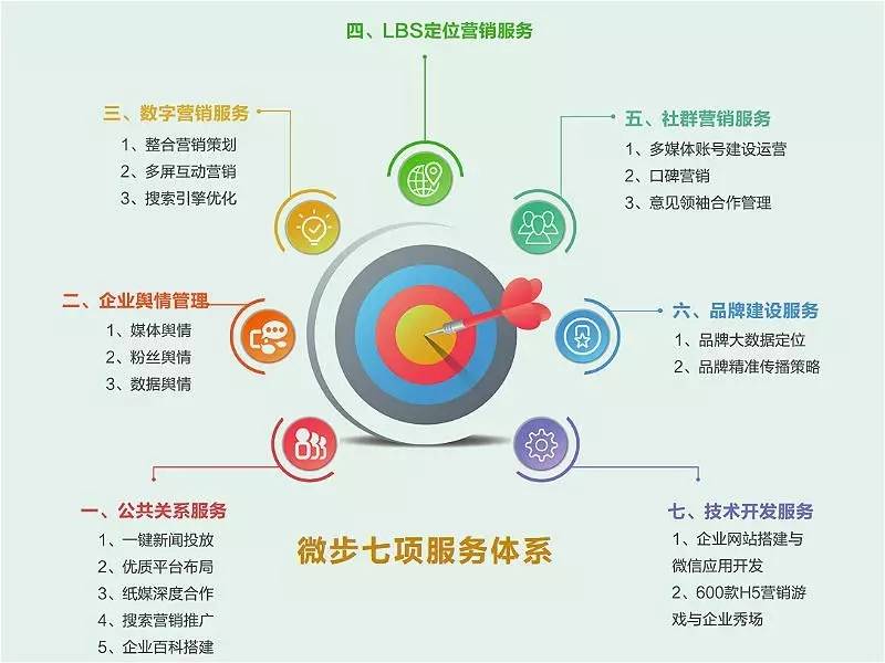 整套流程包含大数据决策分析系统、LBS定位营销系统、整合营销媒体自助投放系统、舆情管理系统、企业网络营销及品牌自检系统、效果评估系统六大模块。