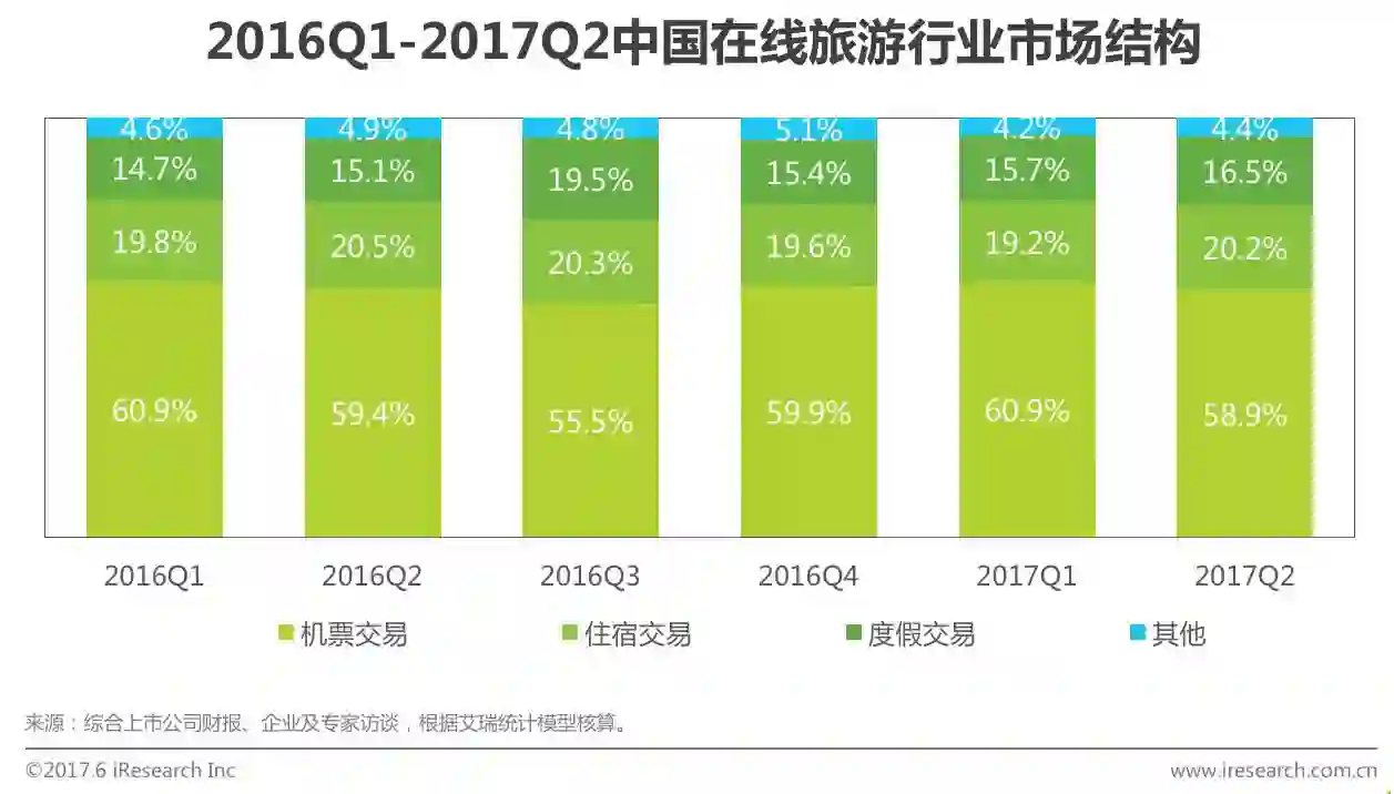 2017Q2机票占比58.9%,相较Q1下降2个百分点。Q1受春节期间返乡热潮影响,以探亲为目的的出行人数激增,因此机票交易占比略有提升。Q2出行目的主要以度假、商旅为主,因此机票市场份额降低。