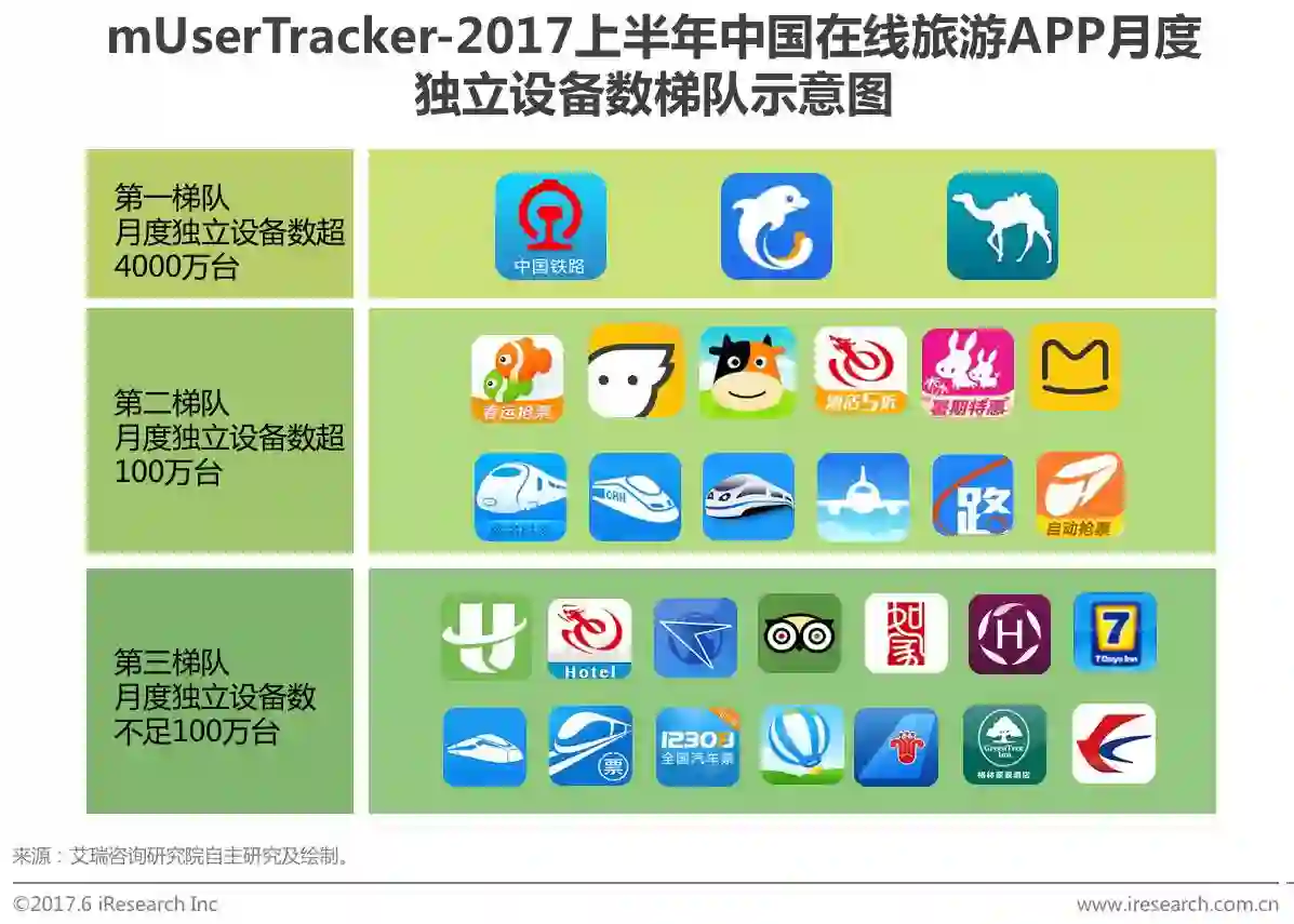 根据艾瑞mUserTracker监测数据,以月度独立设备数为指标,可将在线旅游APP划分为三个梯队,其中铁路12306、携程旅行、去哪儿旅行月度独立设备数均超过4000万台,为第一梯队。第二梯队月独立设备数超过100万台,主要分为在线旅游企业和票务预订类APP,包括去同程、飞猪、高铁管家等APP。第三梯队月独立设备数不足100万台,主要企业包括TripAdvisor,如家、华住酒店等企业。