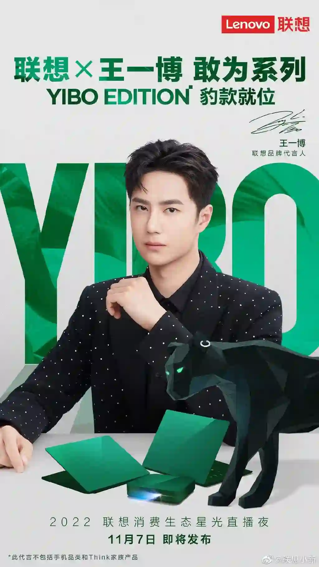 联想宣布,将于 11 月 7 日联合品牌代言人王一博发布“敢为系列”YIBO EDITION 新机,号称“豹款”,同时还公布了“星曜黑豹’海报。从海报来看,新品将包括两款笔记本电脑和一款投影,不包括手机和 Think 家族。不出意外的话,新机将是联想小新 Pro 14 系列、小新 100 智能投影仪的联名机型,可能会有新配色。
