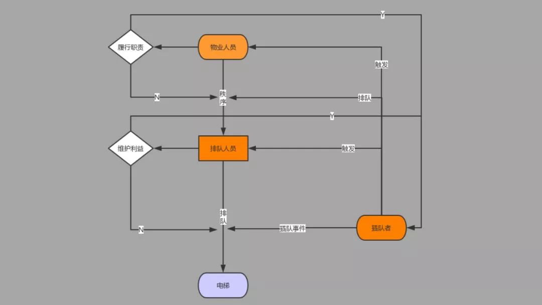 排队人员为在该场景中对电梯的使用者,在舆论、自身规范性或道德规范下,按照先来后到的默认规则,服从物业人员的统一安排,有序完成从排队到进入电梯的整个事件过程。