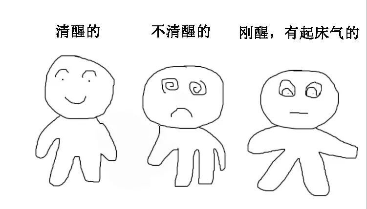 不清醒的:不清醒的人一般没有攻击能力,还沉浸在自己意识中——我看见了,嗯,看见了,早知道早起一会了,哎呦,有点冷啊… …