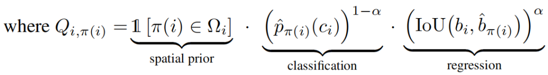 Π是所有预测instance与GT的one2one匹配方案的集合,Π_hat是这个集合里面是Q之和最大的方案。Spatial prior是GT外接框所对应的feature map区域=1,其他区域=0,人为的限定了匹配的proposal必须在GT框内找。classification是预测类别的交叉熵,regression是定位的iou值。α是超参数。通过匈牙利算法找到最佳的Π_h。