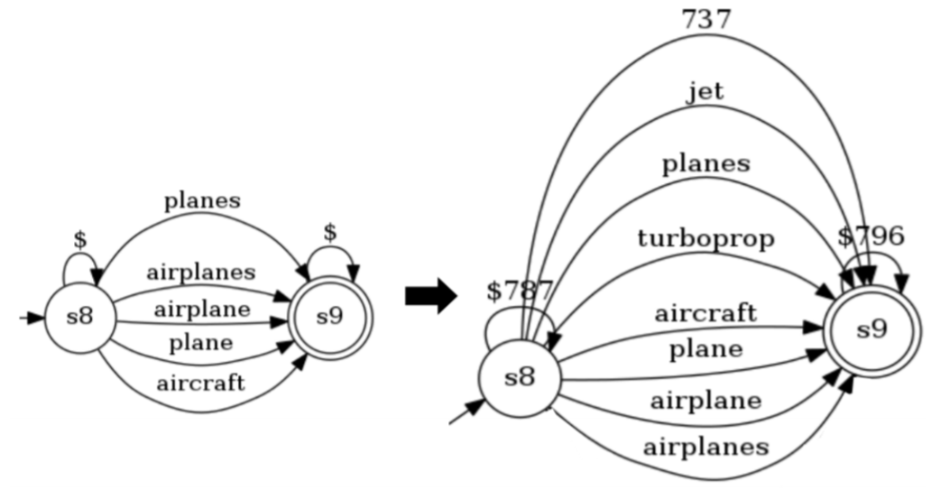下图展示了 ATIS 数据集中在训练前与训练后针对 [aircraft] 类别的自动机变化。可以看到,新的自动机可以考虑更全面的情况,例如识别到句子中有 jet, 737(boeing) 的时候认为该句子在描述 aircraft。