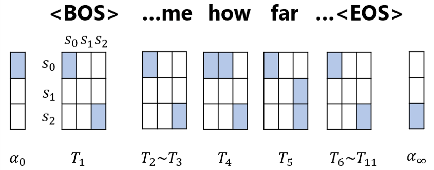 我们会发现,这个有限状态自动机可以用一个三维张量,以及两个向量表示,张量的三个纬度分别是词表大小 V,自动机状态数 S,以及状态数 S,可以看成是由每个单词对应的转移矩阵 stack 起来组成。两个向量分别表示了自动机的初始状态以及结束状态。