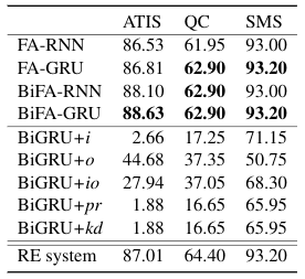 例如在 ATIS 数据集(Hemphill et al., 1990)中,规则系统的准确率为 87.01%,FA-RNN 仍然能够达到 86.53% 的准确率,而大部分的神经网络初始的准确率近似于随机。另外,我们提出了 FA-RNN 的双向以及门控变体,不过模型可解释性相应下降了。