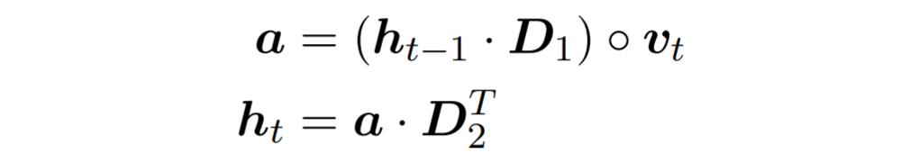 我们利用了张量秩分解(tensor rank decomposition,CP decomposition)的技术,用 ER, D1, D2 三个大小分别为 VxR, SxR 与 SxR 的矩阵来近似表示原来的张量,其中,S 为自动机状态数,R 为 rank 数。原来公式 (1) 中的迭代公式由此变为了: