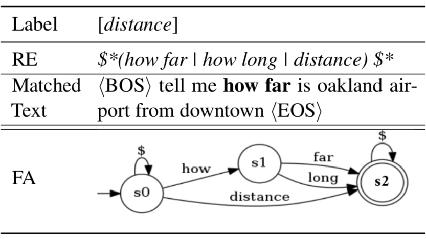 正则表达式是在工业中最常用的规则之一。我们以意图分类数据集 ATIS 中的一个类别 [distance] 为例:根据常识,如果问句里面包含“how far”,“how long”或者 “distance”,那么通常这句话就与[询问距离]有关。