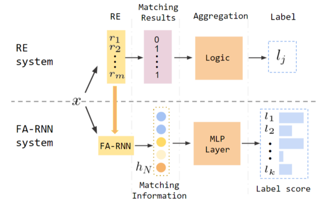 有了 FA-RNN,我们就可以用它构造规则系统的“神经网络版本”,如图二的下半部分所示。FA-RNN 的最后一个“hidden state”包含了正则表达式的匹配信息,我们可以通过一个 MLP 来整合匹配结果。