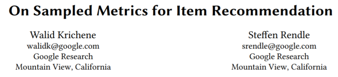 最佳论文奖由来自谷歌研究院的 Walid Krichene 和 Steffen Rendle 获得,获奖题目为《On Sampled Metrics for Item Recommendation》