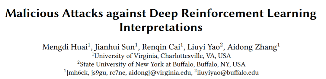 来自弗吉尼亚大学的 Mengdi Huai、Jianhui Sun、Renqin Cai、Aidong Zhang 和来自纽约州立大学布法罗分校的 Liuyi Yao 获得了最佳论文奖的亚军,获奖论文是《Malicious Attacks against Deep Reinforcement Learning Interpretations》。