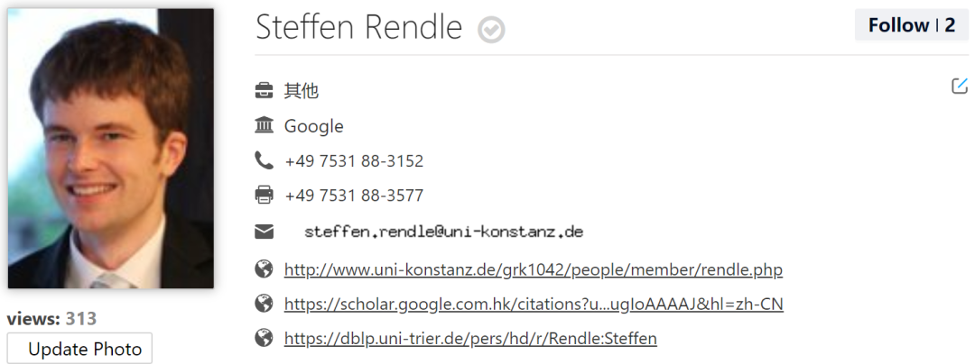 个人主页:https://www.aminer.cn/profile/steffen-rendle/53f42ec2dabfaee1c0a454a5