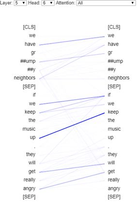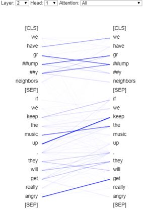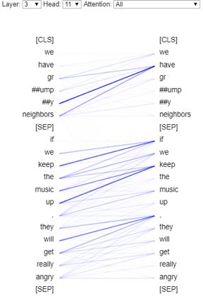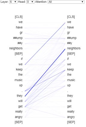 我们忽略了与“[CLS]”和“[SEP]”标记相关的注意力值。我们尝试使用了几个句子,发现想不过度解释它们的结果很难。所以你可以随意用几个句子在这个colab notebook上测试我们的假设。请注意,在图中,左侧序列“注意”右侧序列。