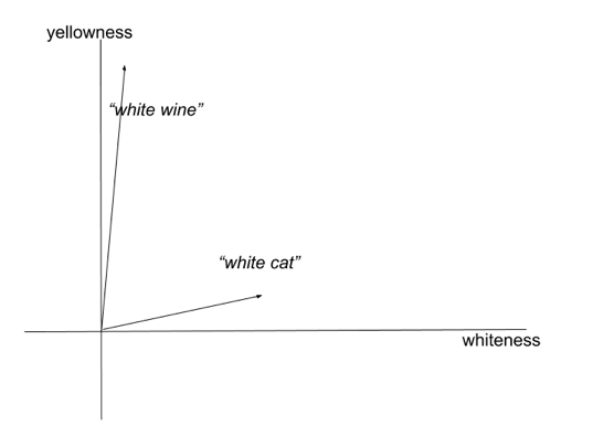 “white wine” (白葡萄酒)和 “white cat” (白猫)在二维语义空间中的表征(空间的维度是颜色)