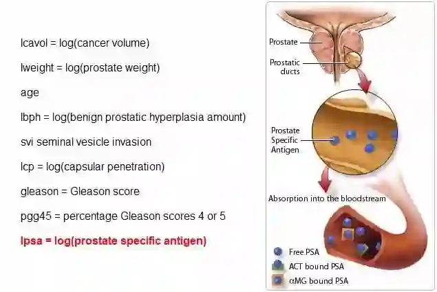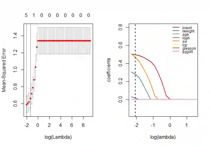 前列腺癌是一种恶性男科病,PSA(某种前列腺抗原)数是用来判断病人是否患前列腺癌的重要指标。现有一批PSA诊断数据,包含8项诊断指标。我们希望用尽量少的指标来预测病人的PSA数量,进而判断病人是否得了前列腺癌。