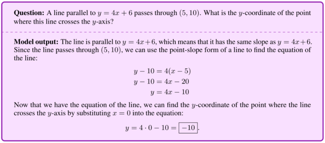 Minerva 解决数学问题:平行于 y=4x+6 的线,且穿过 (5,10)。问这条线与 y 轴相交的点的 y 坐标是多少?下面是 Minerva 解答过程: