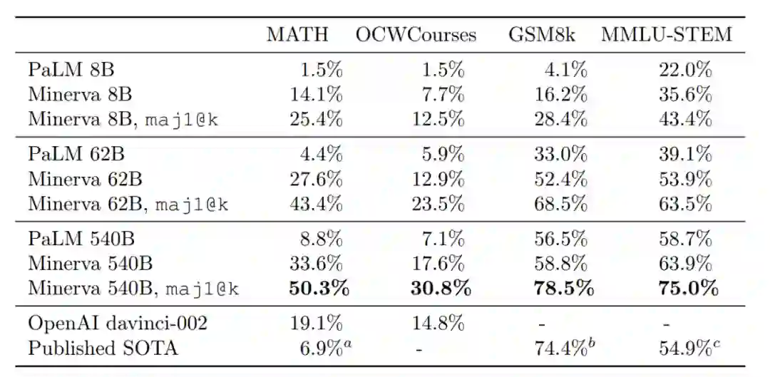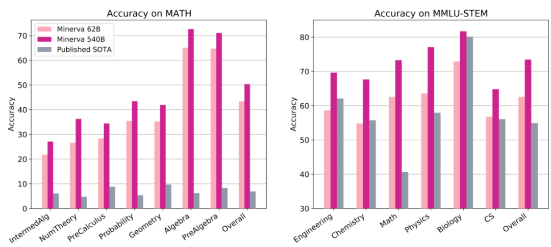 总体来看,Minerva 540B 在小学、高中和大学级别的 STEM 评估数据集上,均取得了显著优于已有 SOTA 的结果。