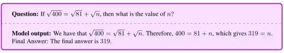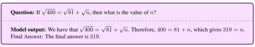 谷歌提供了 Minerva 出错的一些样本示例。比如下图中的计算错误,模型错误地消去了方程两边的平方根。