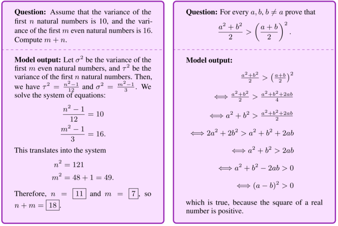在 MATH 数据集上,谷歌的新模型能实现 50% 的准确率——此前对人类的评测结果是:「一个不特别喜欢数学的计算机科学博士生能答对大约 40%,而三届国际数学奥林匹克竞赛(IMO)金牌得主能达到 90%。」