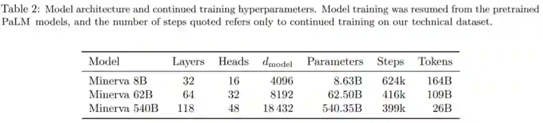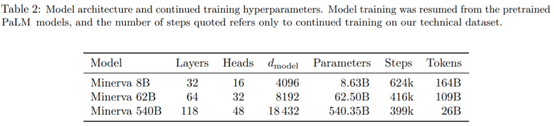 下表 2 包含了 Minerva 主要的模型和训练超参数,最大的模型具有 540B 参数,在 26B token 上进行了微调。