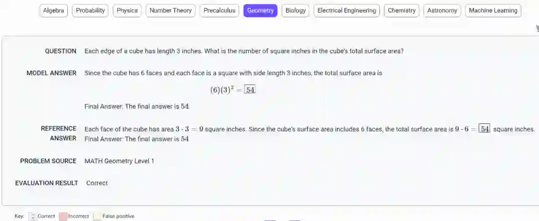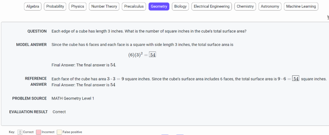 此次,谷歌还提供了交互式示例浏览器来探索 Minerva 的输出!从 Minerva 浏览器界面可以看出,Minerva 不仅可以解决代数问题,还能解决物理、数论、几何、生物、化学、天文学等众多问题。