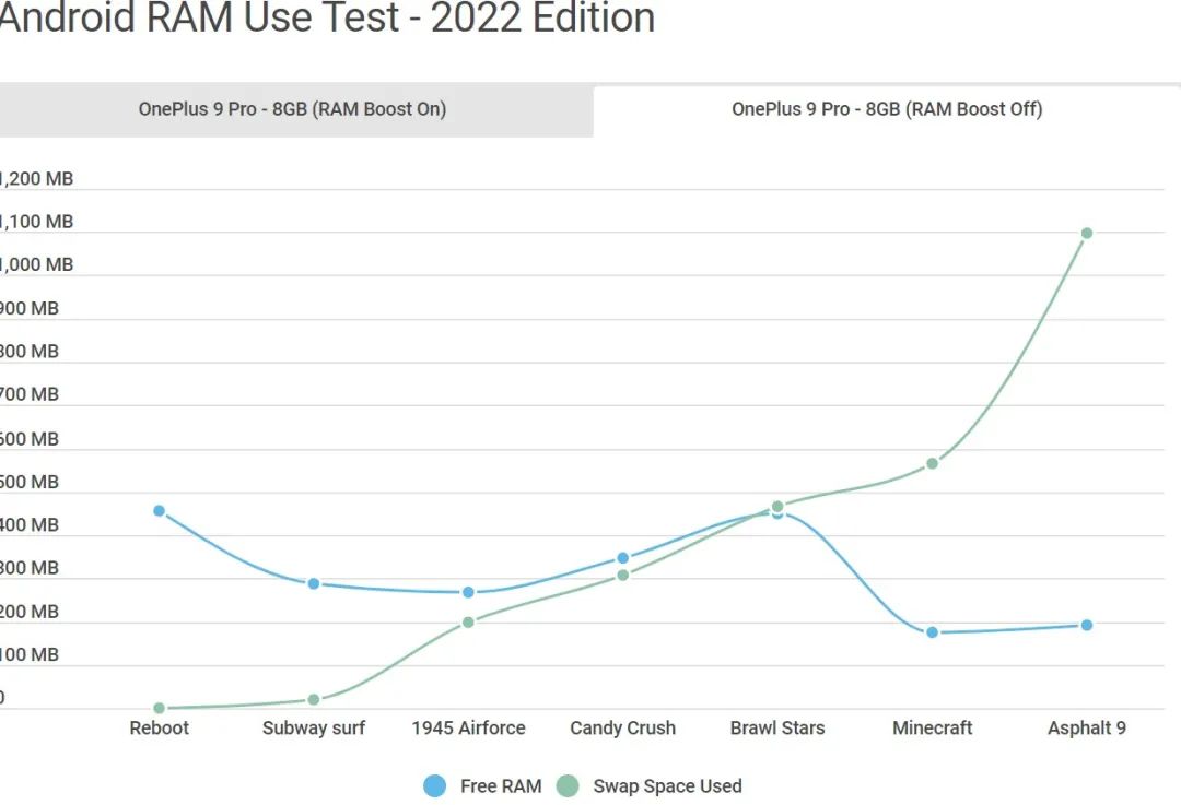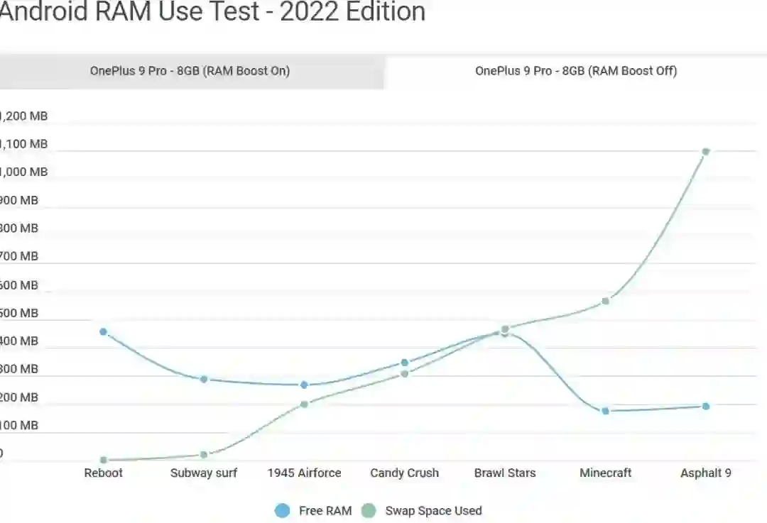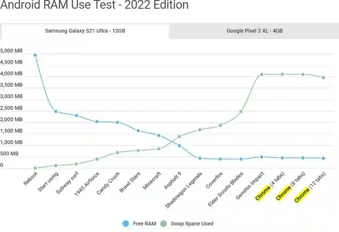 从结果来看,12GB 内存的三星 Galaxy S21 Ultra 能将所有游戏保留在内存中。随着游戏一个接着一个打开,空余内存逐渐减少,用于缓解内存压力的交换空间(Swap Space)使用率逐渐提高,但没有一个应用被清除。加入谷歌 Chrome 浏览器并打开 12 个标签页之后,才终于有一个游戏被杀掉,需要重新打开。