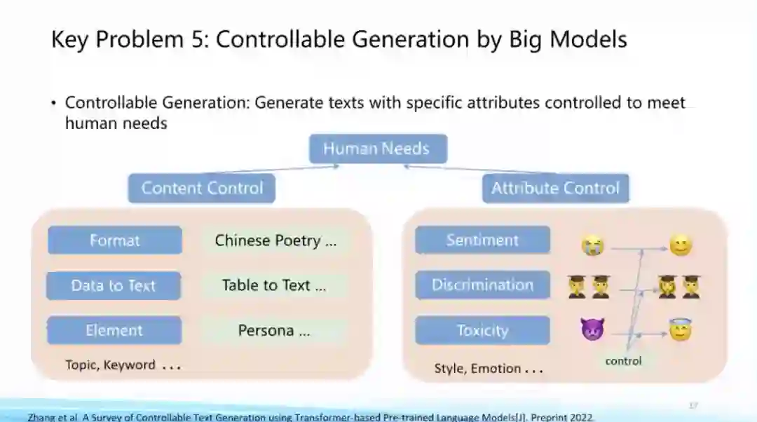 这方面也有一些开放性问题,比如如何建立一个统一的可控生成框架,如何实现比较好的评测方法,对生成的文本进行概念性甚至事实性的自洽检测,以及如何针对新的数据进行相关的生成。