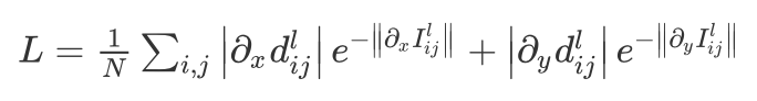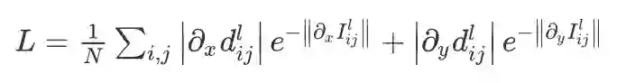 由于我们需要密集的视差图,为了使得视差在局部上保持平滑,我们可以对视差梯度 ∂d 进行 L1 惩罚。由于深度不连续性通常出现在图像的梯度上,因此图像的梯度 ∂I 也被考虑进来。