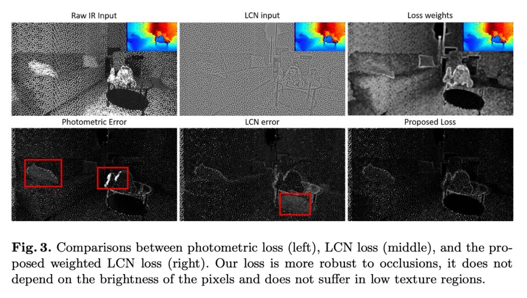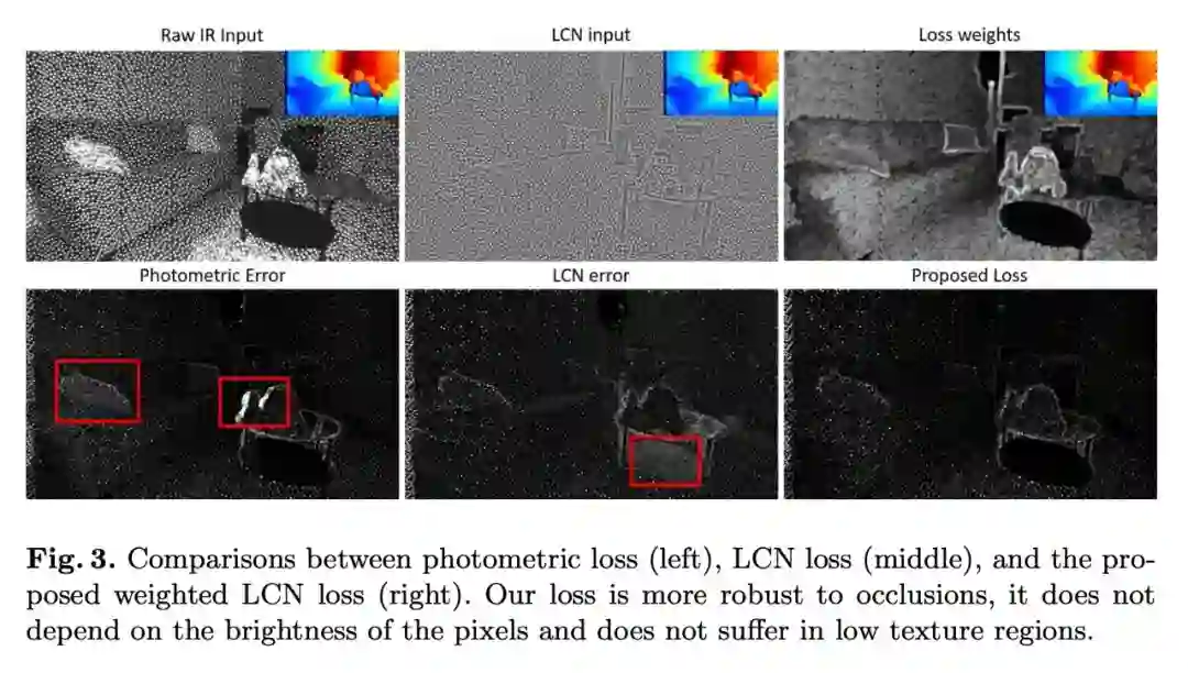 由上图可以看出,对于仅使用重构误差(左图),在红色框中较亮的部位对应的重构误差较大。而采用 LCN 对输入图像归一化处理后(中间图),这些重构误差不会过渡的偏向明亮的区域。这表明 LCN 不仅消除了光度和视差之间的联系,而且在遮挡区域能够提供较好的残差。