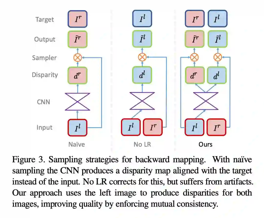 和原有方法不同,输入是左图(双目是左右图),输出不仅是以左图为参考图像的视差图 , 还有以右图为参考图像的视差图 。除了应用上述两种损失函数外,还提出了一种左右视差一致性损失。