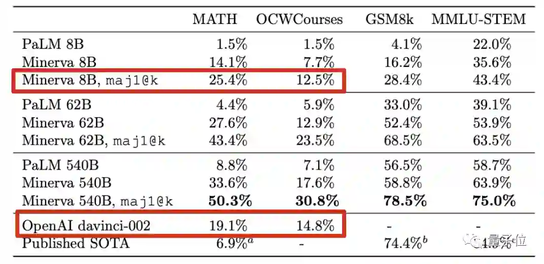 甚至80亿参数版的Minerva,在竞赛级数学题和MIT公开课问题中,也能达到GPT-3最新更新的davinci-002版本水平。
