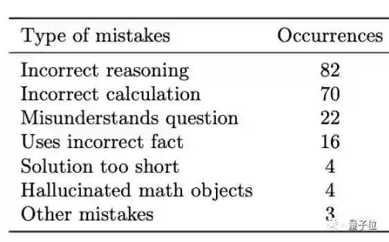经过分析之后,团队发现主要的错误形式来自计算错误和推理错误,只有小部分来自题意理解错误和在步骤中使用了错误的事实等其他情况。
