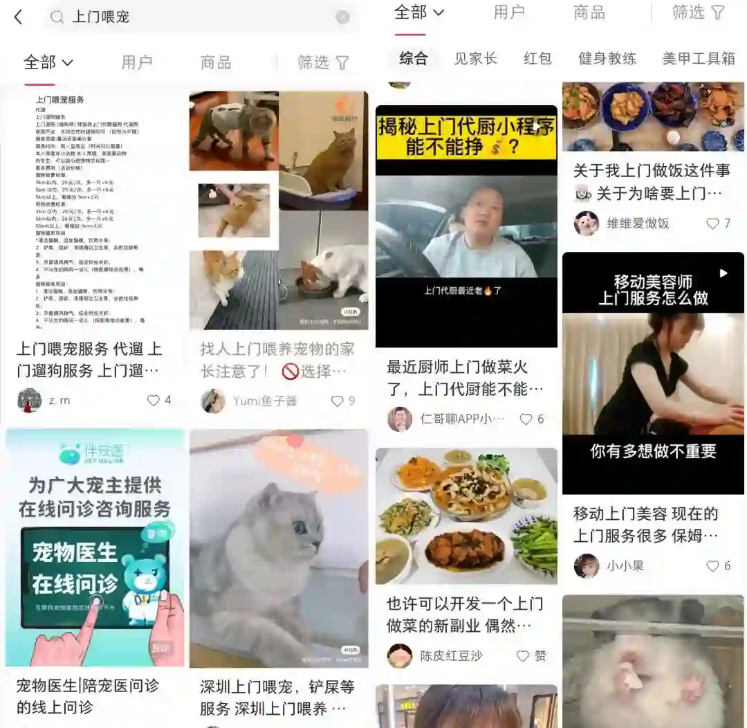 很多用户,原本并没有意识到会有人提供上门服务,但日常刷小红书、抖音这些互联网平台的过程中,就有可能接收到关于上门服务的推送信息,然后就发现:原来还有这种方式,能满足自己在家就能享受各种服务的需求!